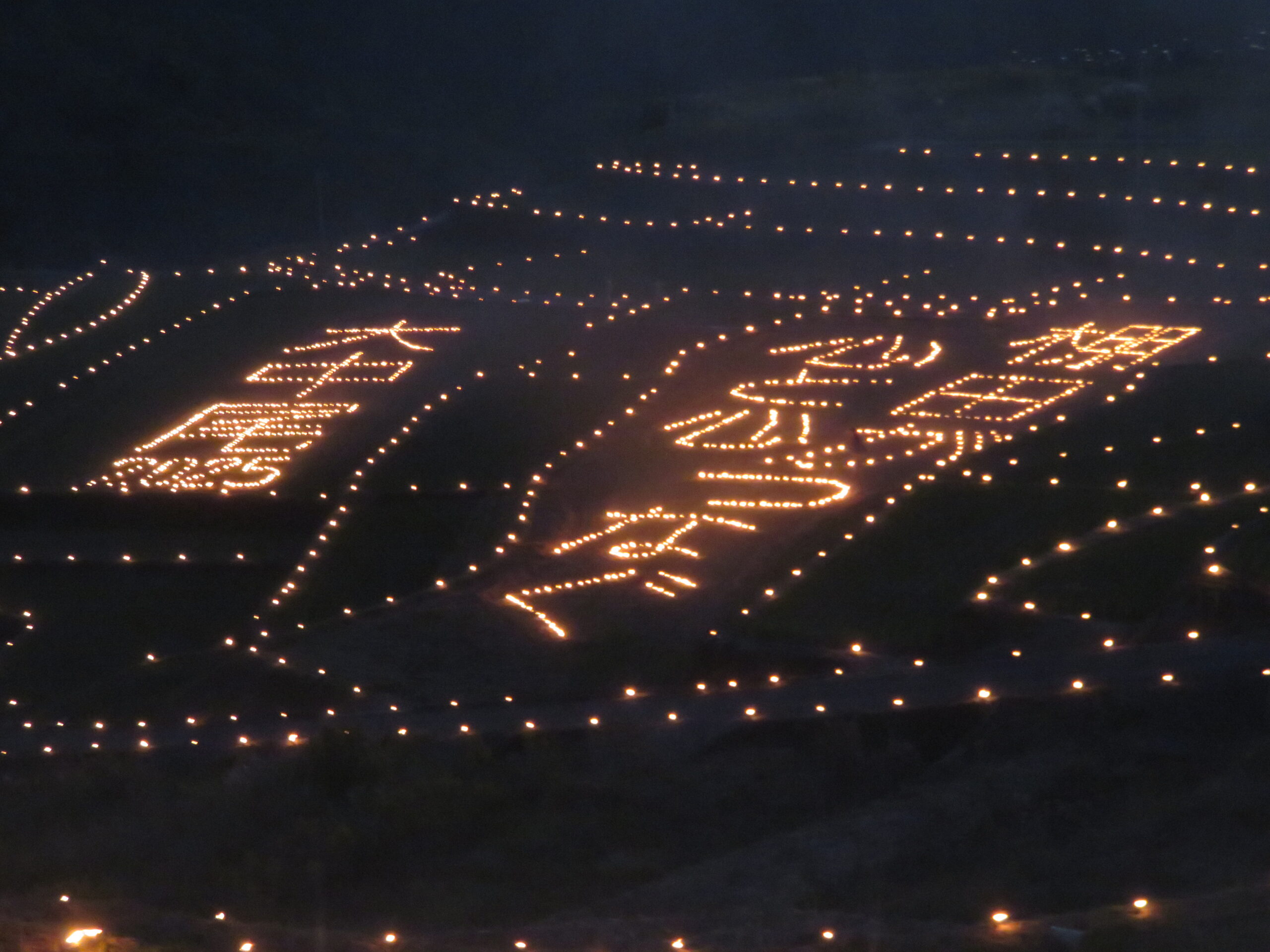 棚田には毎年、メッセージとイラストが灯されます。